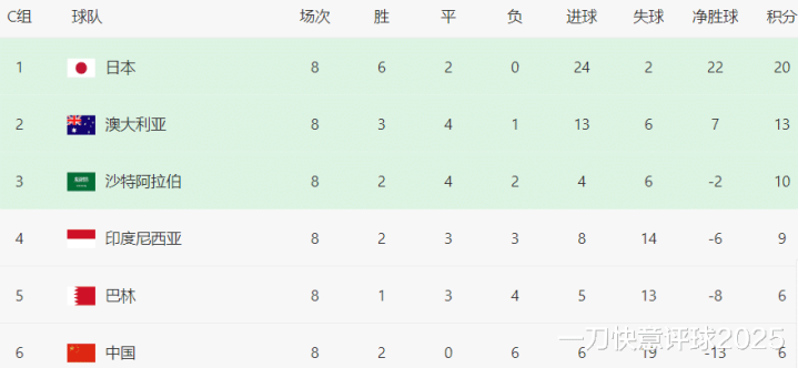 目前在C组积分榜上,日本队已提前出线,澳大利亚队积13分暂列第二,沙特队10分排名第三,而中国队和巴林同积6分并列小组倒数第一。国足最后两轮即便全部取胜,也将丧失小组前两名直接晋级世界杯的资格,现在只能全力争夺小组第三和第四名的附加赛资格,且形势非常不容乐观。